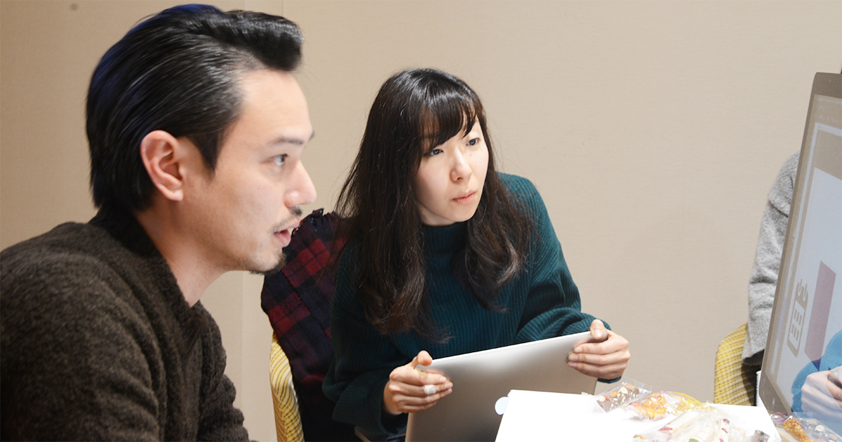 メタフェイズさんのデザインチームリーダー小畑さんが、弊社畠山の作成したデザインを目の前でブラッシュアップをしていきます。
