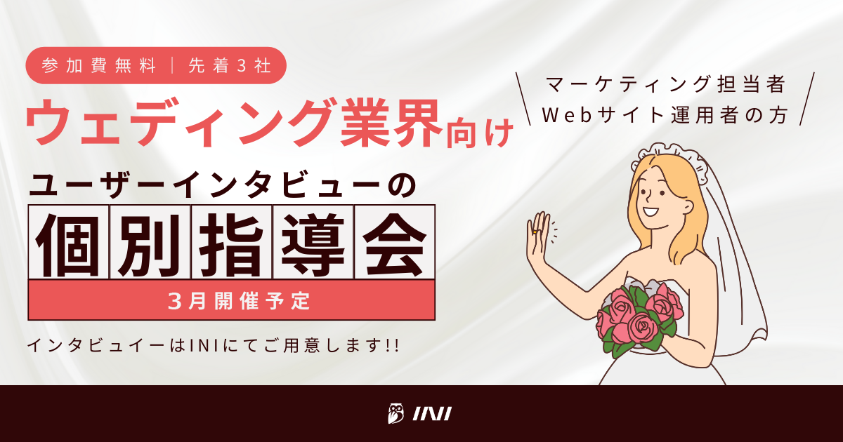 今回のユーザーインタビューのテーマは「ウェディング事業」になります。INIでインタビュイーをご用意致します。詳しくは下記をご覧ください。