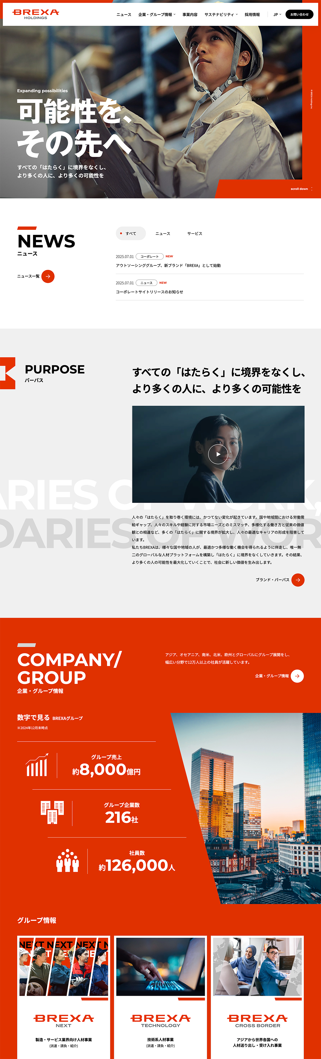 本プロジェクトは、アウトソーシンググループ(現BREXAグループ)のホールディングス化・ブランド変更に伴い、新たなホールディングスのWebサイトの新設、既存のグループ会社(株式会社BREXA Next、株式会社BREXA Technology、株式会社BREXA CrossBorder)の Webサイトのリニューアルを行いました。